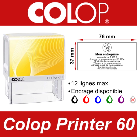 Mandat Administratif, Chèque, VirementLe tampon encreur personnalisé Colop Printer 60 offre une large empreinte de 76 x 37 mm, permettant d'imprimer jusqu'à 12 lignes de texte ou un logo. Robuste et conçu pour un usage intensif, il garantit des impressions nettes et précises. Son design ergonomique et sa cassette d’encre interchangeable en font un outil fiable et pratique pour les professionnels.