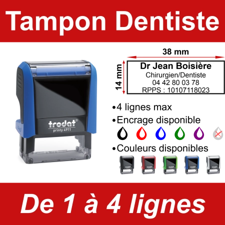 Tampon Dentiste 4 lignes – Tampon professionnel compact avec 4 lignes personnalisables. Format 38×14 mm, encreur inclus, plusieurs couleurs disponibles. Fabrication française et expédition rapide.