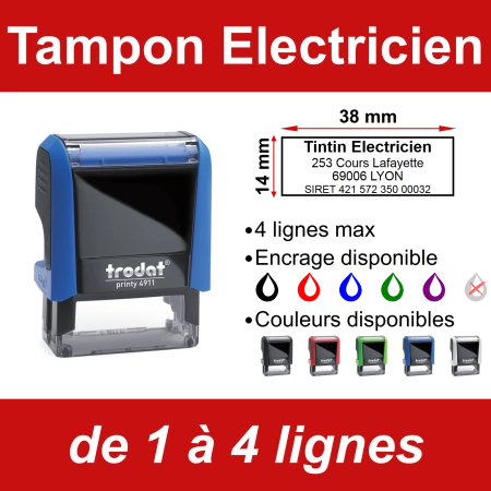 Tampon pour électricien personnalisable sur 4 lignes. Parfait pour inscrire nom, entreprise, SIRET et coordonnées sur vos documents professionnels. Compact, lisible et adapté à un usage quotidien.